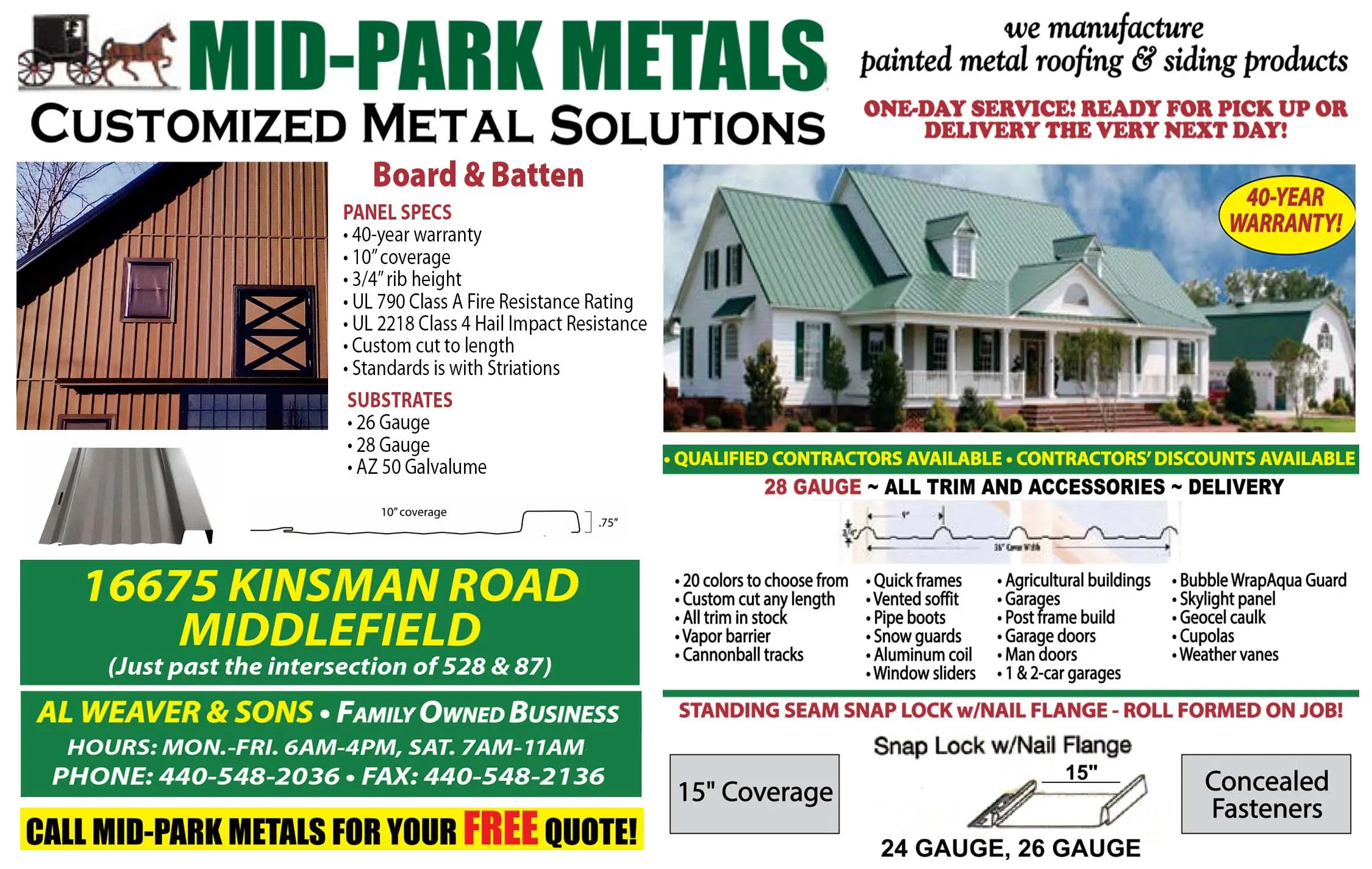Located in the heart of northeast Ohio Amish Country, Mid‑Park Metals is a family-owned leader in the custom fabrication of painted metal roofing and siding. Known for their precision, durability, and next-day service, they’ve built a reputation on quality and trust that extends across northeast Ohio and beyond.